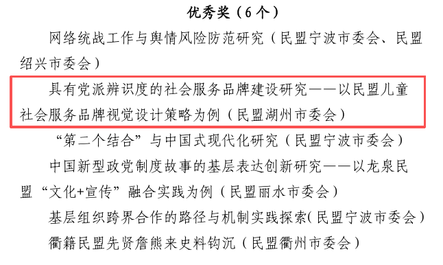 近日,民盟浙江省委会发布了关于表彰2025年度参政党理论研究获奖课题的决定,我校民盟支部研究课题“具有党派辨识度的社会服务品牌建设研究——以民盟儿童社会服务品牌视觉设计策略为例”获得优秀奖。